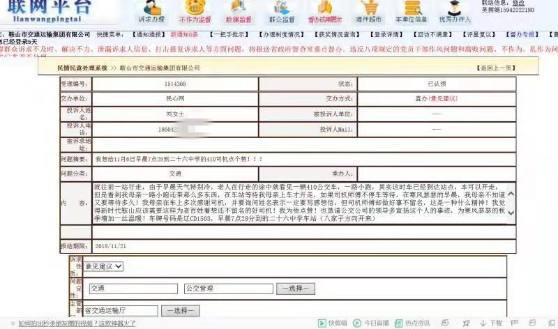 劉女士在反饋件上寫(xiě)到:各位相關(guān)領(lǐng)導(dǎo),你們好!事情的經(jīng)過(guò)是這樣:我母親早晨在鐵西八家子等車(chē),由于不知道八家子這個(gè)站點(diǎn)已經(jīng)不停站,等了30多分鐘,經(jīng)過(guò)好心人的提醒就往前一站行走,由于早晨天氣特別冷,老人在行走的途中就看見(jiàn)一輛410公交車(chē),一路小跑,其實(shí)這時(shí)車(chē)已經(jīng)到達(dá)站點(diǎn),本可以開(kāi)走,但是看到我母親一路小跑還帶那么多東西,在車(chē)站等待我母親上車(chē)才開(kāi)走,如果司機(jī)師傅不停車(chē)等待,在寒風(fēng)瑟瑟的早晨,我母親不知道又要等待多久!我母親在車(chē)上多次感謝司機(jī),并要詢(xún)問(wèn)姓名表示一定要寫(xiě)感想信,但司機(jī)師傅卻做好事不留名,這是一種什么精神!我覺(jué)得新時(shí)代鞍山應(yīng)該需要這樣為老百姓著想還不留名的好司機(jī)!我為他點(diǎn)贊!也懇請(qǐng)公交公司的領(lǐng)導(dǎo)多宣揚(yáng)這個(gè)人的事跡,為寒風(fēng)瑟瑟的秋季增加一絲溫暖!車(chē)牌號(hào)碼是遼CD1503,早晨7點(diǎn)28分到的二十六中學(xué)車(chē)站(八家子方向開(kāi)來(lái))。