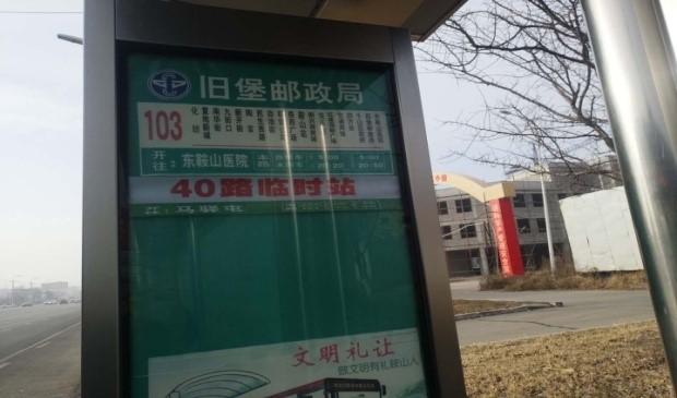 40線站序:明達(dá)世紀(jì)花園 – 鞍山人才市場(chǎng)-米蘭小區(qū) –匯園大道 – 莘英路-長(zhǎng)興街 - 鐵東區(qū)法院- 新?tīng)I(yíng)廣場(chǎng) – 解放東路- 園林大道- 中華南路 - 榮譽(yù)街 - 新華園 - 交通賓館 - 千山區(qū)政府 – 舊堡郵政局(臨時(shí)站)-舊堡 - 千山區(qū)委--馬驛屯